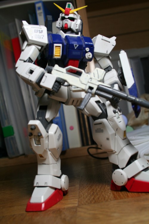 この陸ガンは、有名なガンダム(RX-78)の生産過程において、余剰となった比較的精度の低いパーツを使い、宇宙戦用装備を取り除いて作られた機体です。